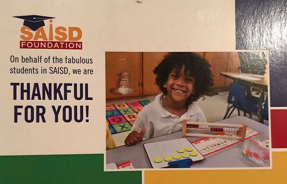 “In this season of reflection, I wanted to express to you how thankful I am for your support in enhancing the educational experience of our kids in SAISD. It warms my heart to know how you care about our kids community wide and that you believe in the good work being done by our teachers and district leadership. It is fulfilling to see the growth in our base of support. Together we can foster a better tomorrow for our kids and our community.”